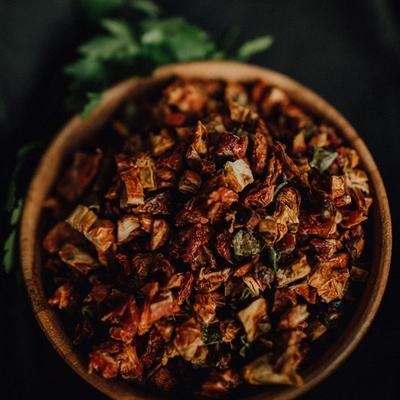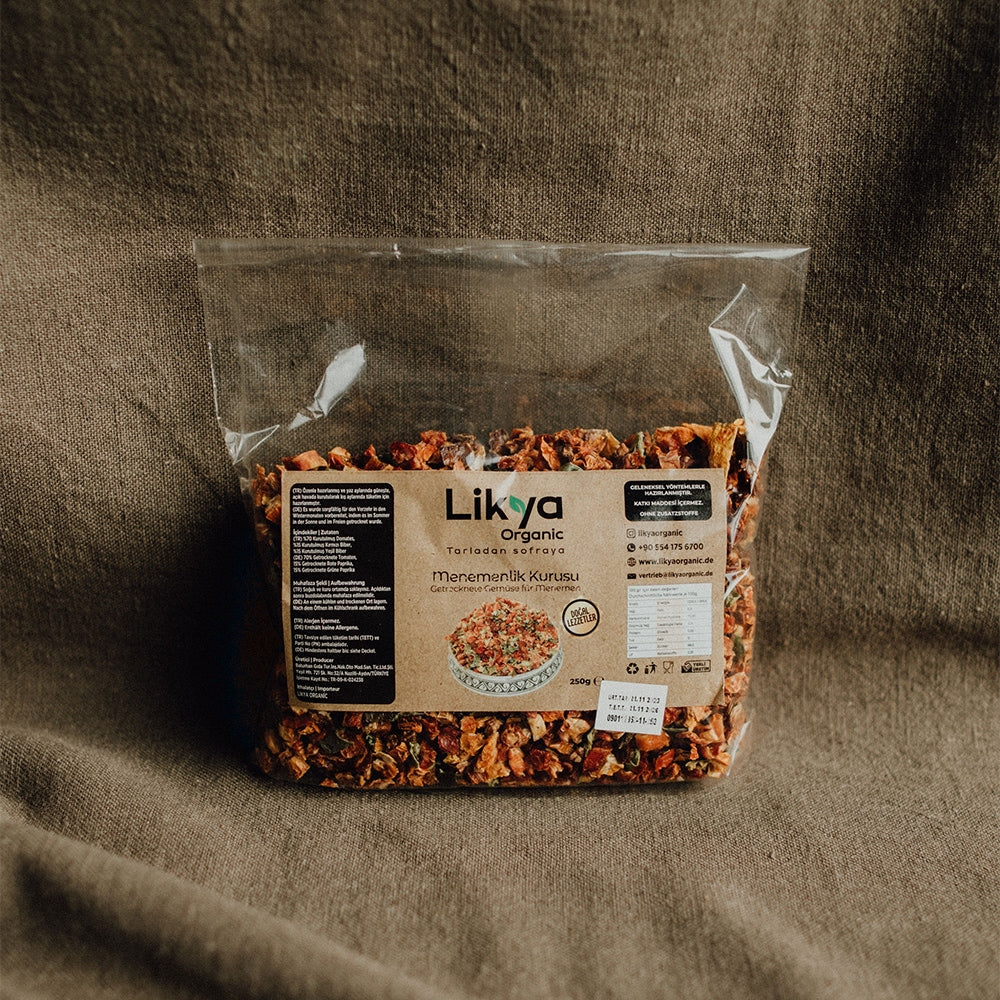 🌱 Likya Organic’ in Menemenlik Kurusu, Aydın’ da topladığımız domates, yeşil biber ve kırmızı biberin doğal, geleneksel ortamda kurutulmasıyla elde edilir.