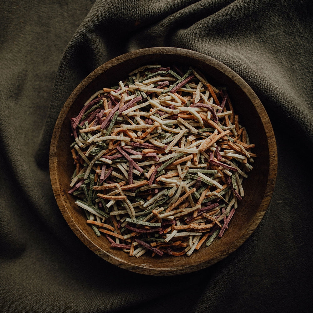 🌱 Havuç, ıspanak, kırmızı pancar, bal kabağı, domates, kapya biber, köy unu ve yumurtasından hazırladığımız bir tür makarnadır.